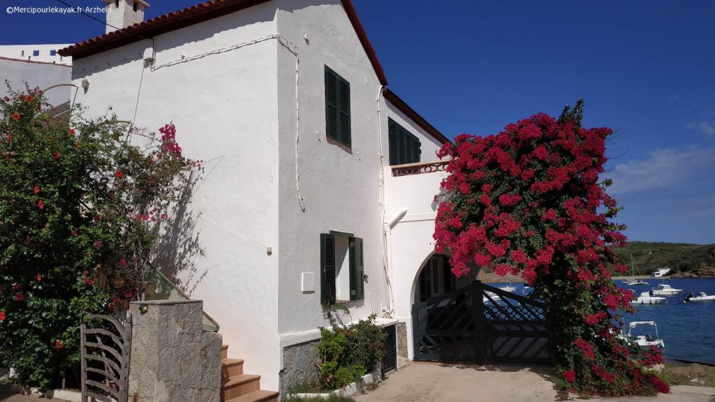 Après une belle portion rocheuse et le passage de la Punta Sa Cudia, nous atteignons Es Grau après une navigation sportive. Ce village représente un bel habitat local où les bougainvilliers en fleurs éclatent de couleurs sur les murs blancs. C’est une bonne étape pour se promener, acheter de l’eau, et découvrir la base et la boutique de Menorca en kayak.