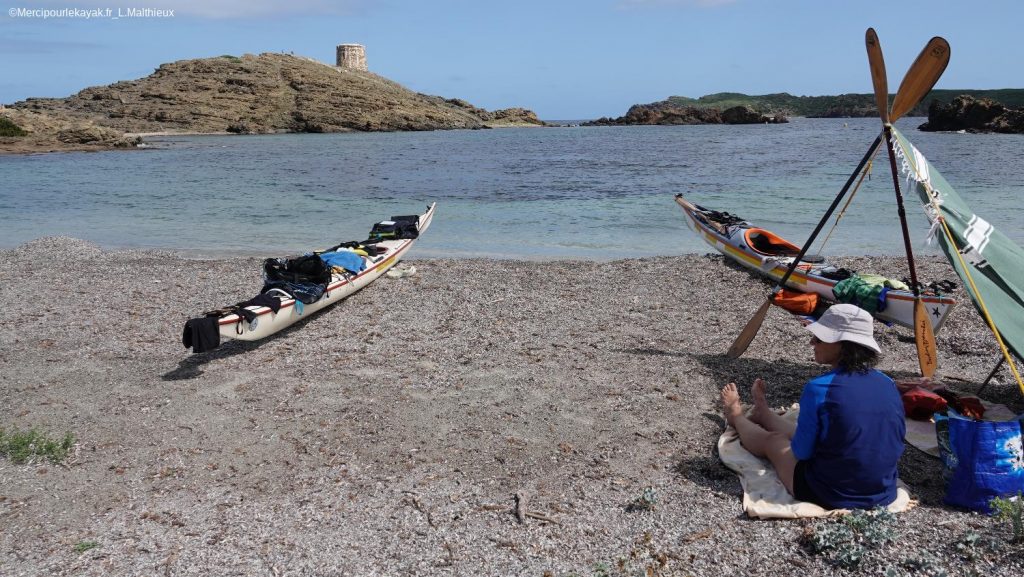 Nous laissons à tribord le « lagon » de Es Grau, paradis des « sit on top » de location et où de nombreux bateaux mouillent devant les plages de l’Illa d’en Colom. Une pause est bienvenue à Cala Tamarells sous la Torre de Rambla, la seule tour de Minorque qui soit ouverte à la visite.
