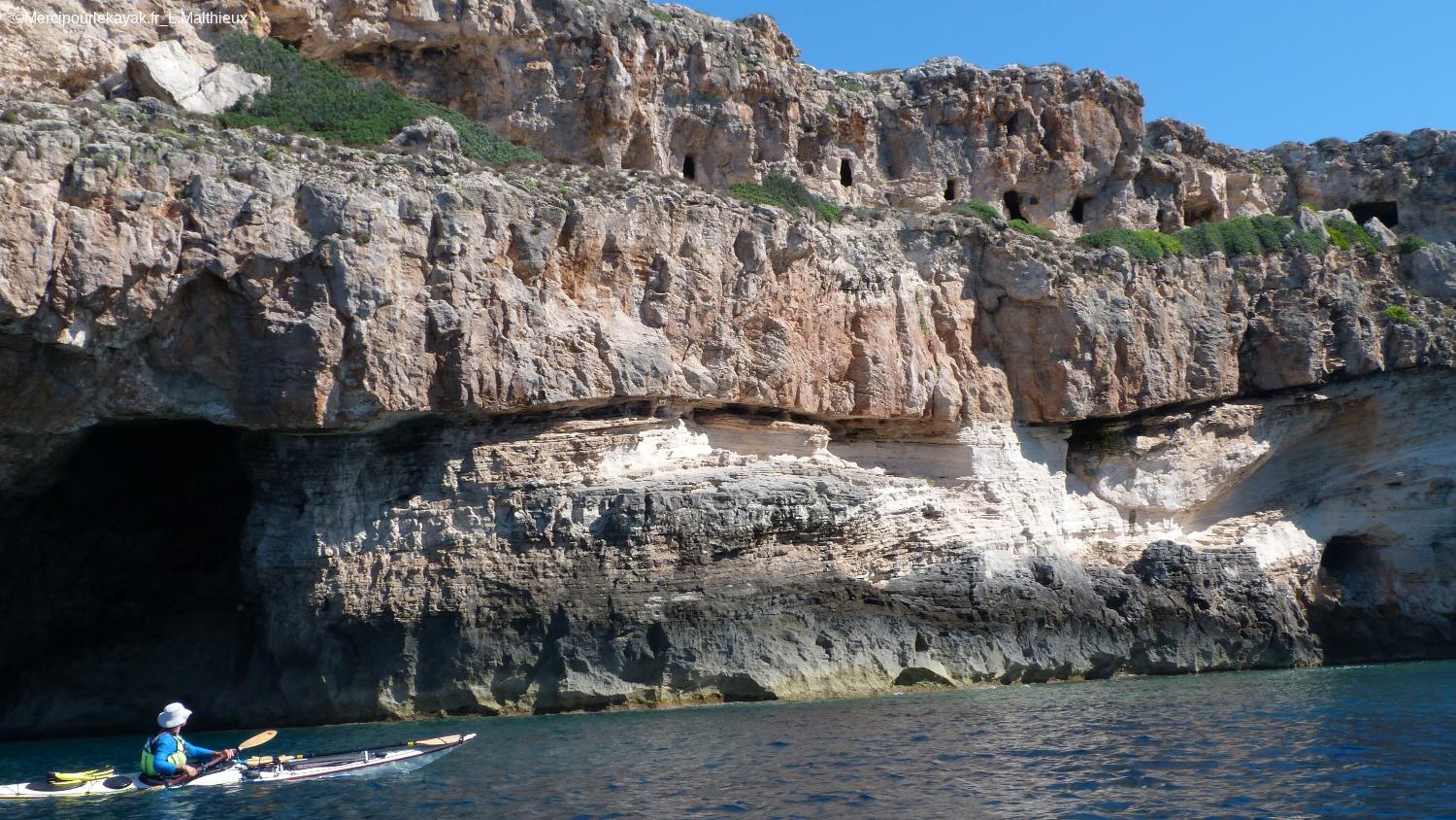 Elles nous mènent jusqu’à Cales Coves, une anse profonde dont les falaises sont percées de trous aux formes rectangulaires : ce sont d’anciennes nécropoles.